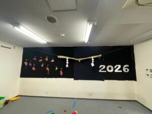 しめ縄は摂津市鳥飼産のマコモタケを使いスタッフが心を込めて制作しました。うん。いいね!
